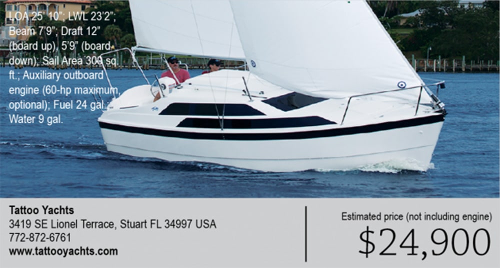 At only about 2,250 pounds dry weight, the 26X used water ballast — fill the tanks at launch for stability, drain them for towing. Add a 50-hp outboard, and this “powersailer” could zip along at speeds no real sailboat should attempt.